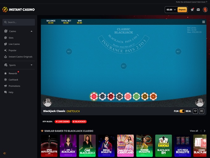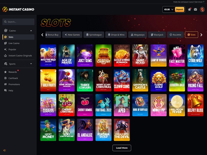 Instant Casino prioritizes quality over sheer volume, offering a well-curated selection of games divided into two main categories: casino games and live dealer tables.