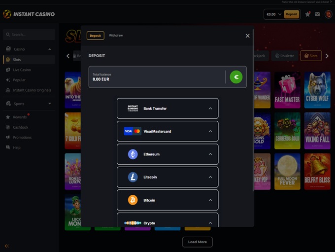 Instant Casino supports a variety of payment methods, catering to both traditional and modern banking preferences. Players can fund their accounts using Mastercard, Visa, Google Pay, Apple Pay, and Interac, while cryptocurrency enthusiasts have the option of Bitcoin. Additional alternatives like Sofort, MiFinity, PicPay, Giropay, and Pix ensure there’s a solution for everyone.