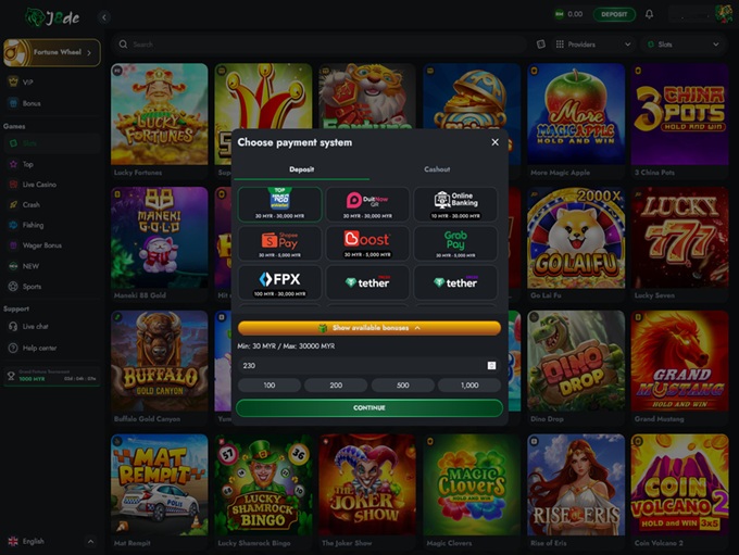 J8de supports a solid mix of local payment options and cryptocurrency. Malaysian players can fund their accounts with popular e-wallets such as DuitNow, Touch’n Go, ShopeePay, and GrabPay. Traditional fiat transfers are available, and crypto users can choose from several blockchain networks – it depends on their preference.