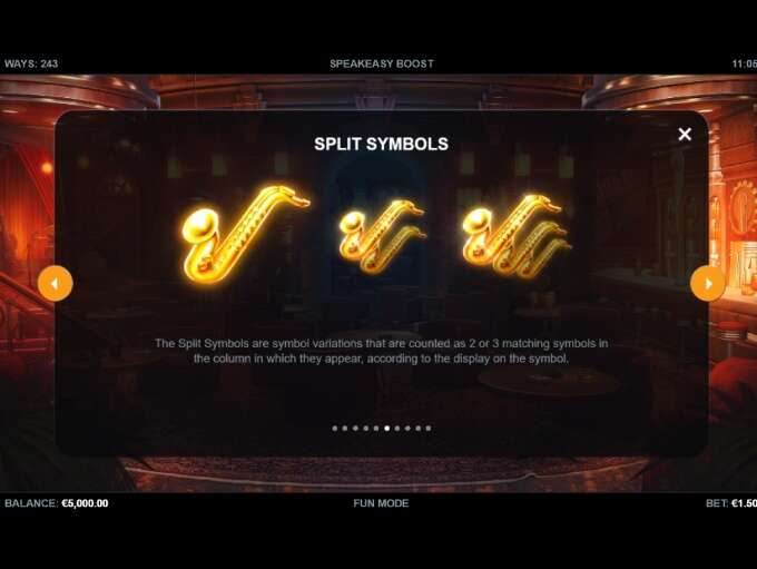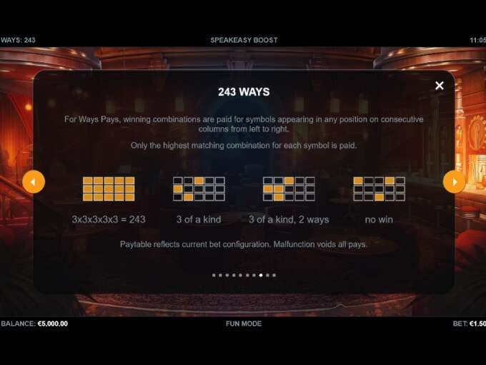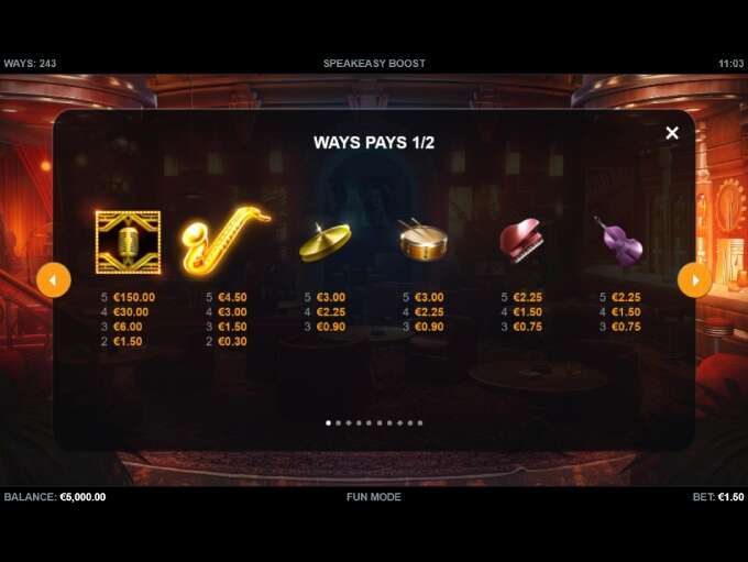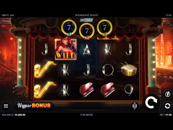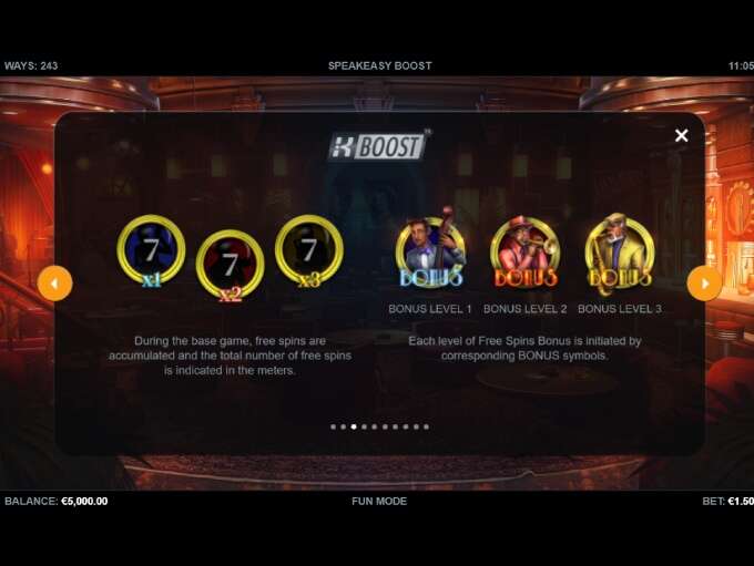 Speakeasy Boost is a 5 reels 3 rows online video game offering you 243 ways of winning, with betting ranges spanning from 0.5 to 60 coins per spin, and the maximum payout of x52520 your stake!