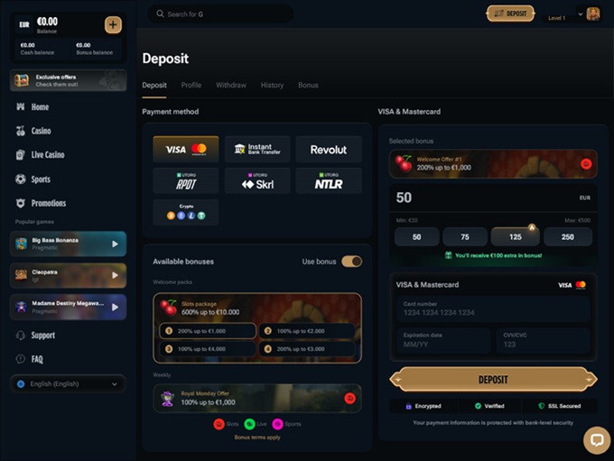 The platform supports multiple currencies and languages, so account setup and payments are far easier for an international audience. Deposit requirements remain accessible for casual players. On the other hand, cryptocurrency deposits offer more flexibility on the upper end compared to traditional methods.