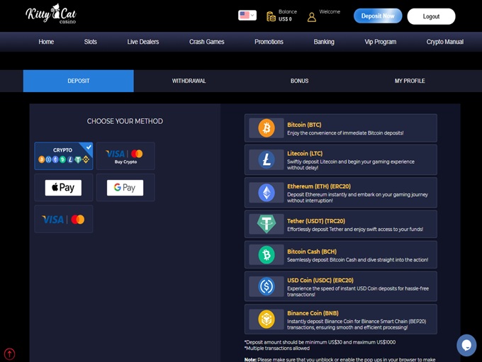 The feline theme adds personality, yet the platform aims to appeal to players seeking a modern crypto casino with flexible payment options and broad access across the US, Canada, and New Zealand.