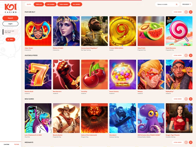 Koi Casino’s extensive game library is powered by a long list of production studios and publishers. These include some popular names in the industry like Big Time Gaming, iSoftBet, Pragmatic Play, Microgaming, Wazdan, Red Tiger, NetEnt, Booming Games, Evolution Gaming, 1×2, Thunderkick, ReelPlay, Relax, Old Skool, and more.