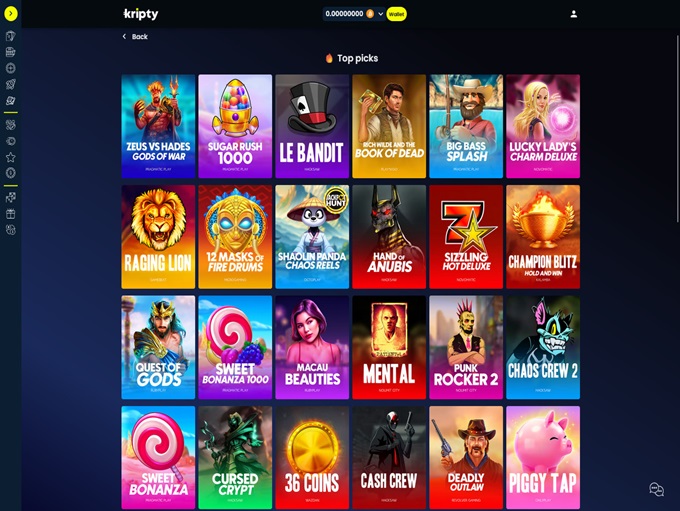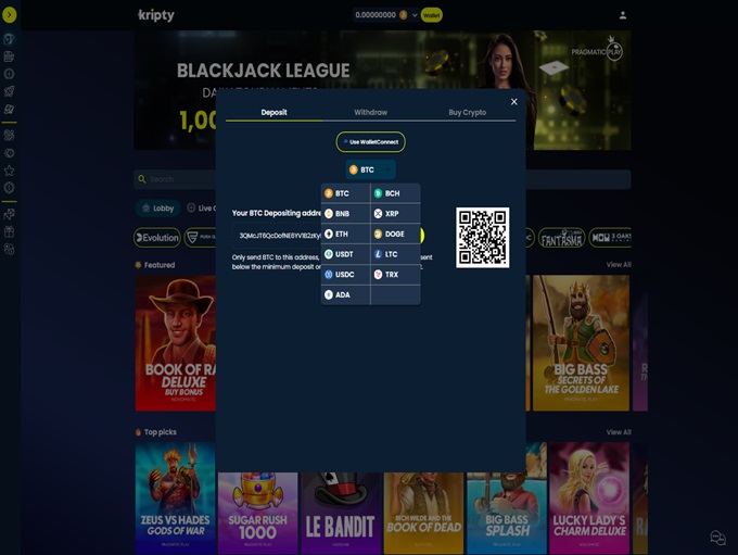 Kripty Casino has a very nice slots collection, featuring everything from classic three-reel slots to modern video slots and progressive jackpots. Big-name titles like Dead or Alive, The Dog Hose, Big Bass Bonanza, and the Immortal Romance series highlight the variety. Other notable titles are: