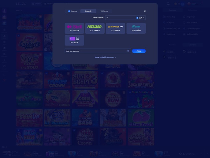The platform offers a wide range of payment options like MasterCard, Neteller, Paysafe Card, Skrill, Trustly, Visa, Jeton Wallet, Bitcoin, Bitcoin Cash, Litecoin, Ethereum, Tether, Sepa, Rapid Transfer, Klarna Instant Bank Transfer…