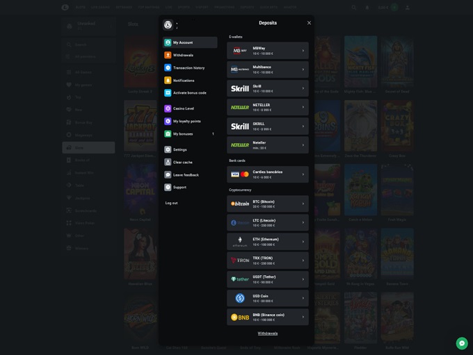 This hub offers a wide range of cryptocurrency options for deposits. Players can use Bitcoin, Ethereum, Litecoin, Tron, Tether, BNB, and USD Coin. The minimum deposit for most cryptocurrencies is equivalent to fiat currencies, with Bitcoin requiring a slightly higher minimum.