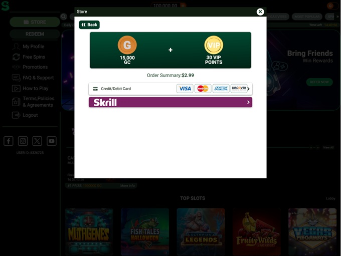 Accessing the coin store is simple. A prominent plus button sits at the top of the site, while the hamburger menu provides another route to view all optional purchases. Like many sweepstakes platforms, this one also enforces a daily cap on redemptions, although there is no limit on how much can be won through free coins earned from bonuses and ongoing promotions.