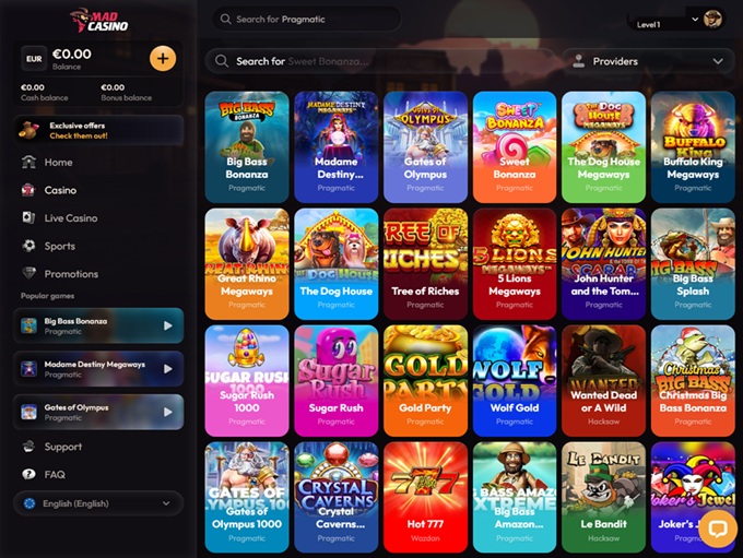Mad Casino partners with a select group of software providers, ensuring quality over quantity when it comes to its game library. Players will find titles from trusted names such as Microgaming, Wazdan, Hacksaw Gaming, Pragmatic Play, Blueprint Gaming, Platipus, Mascot Gaming, and Habanero. Each supplier brings its own style, from engaging slots with unique mechanics to innovative bonus features that keep the action fresh.