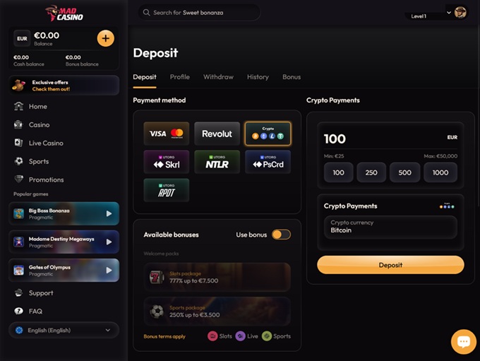 Deposit limits are set at player-friendly levels, though minimal withdrawal thresholds are on the higher side. This may feel restrictive to casual players, while high rollers could find the upper withdrawal cap limiting. On the positive side, Mad Casino doesn’t add extra fees to deposits or withdrawals, which makes transactions more straightforward.
