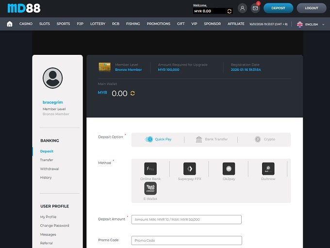 MD88 supports both classic and modern payment options, including local bank methods and crypto like Bitcoin and Tether. The available banking methods and limits depend on what you choose, and they’re shown during the deposit process.