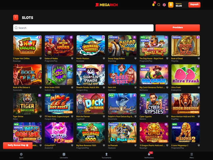 Here we’re dealing with some huge numbers. There are over 5,000 titles in the slots section alone, and once you add everything across the whole platform, the total count is close to double that. But big numbers are easy to throw around if the content isn’t great, so we did the simple thing and checked the provider list. And that’s where Megarich really blew us away. The library is packed with recognizable studios and plenty of popular, high-quality titles. MegaRich works with names like NetEnt, Relax Gaming, Endorphina, Yggdrasil, BetSoft, and a long list of others. The best part is that these studios don’t all build games the same way. Some lean more toward classic-style slots, some go for flashy features and faster dynamics, and some are all about bonus-heavy mechanics. What does that mean for you? It means you get access to very different slot styles in one place, so it’s easy to make every session fun and fresh, and there’s usually something new to try whenever you drop back in.