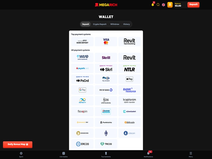 So it’s pretty safe to say crypto gambling is shaping up to be a central part of online gambling and sportsbetting. And with all that said, Megarich does support crypto play, no doubt about it. Alongside crypto options, you’ll also find regular fiat payment methods and a few e-wallet choices too.
