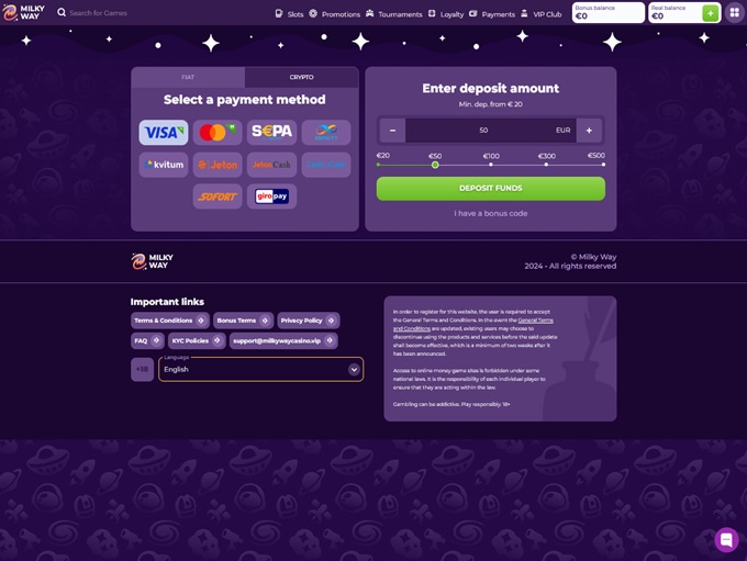 MilkyWay Casino, owned by WoT N.V. and operating under a Curacao License with secure payment processing by Limesco Limited in Cyprus, invites online players on an interstellar journey. Launched in 2023, it boasts a cosmic-like theme and an extensive selection of slots and live dealer tables. Noteworthy features include no-wager bonuses, a non-sticky welcome package, cashback, birthday perks, exclusive crypto offers, and a gamified loyalty program that is multi-layered path of awaiting awards, perks, and gaming experience...