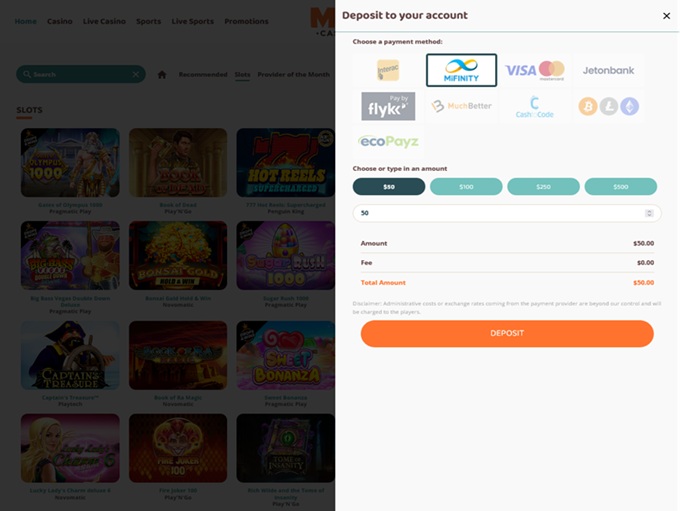 The domain offers a multitude of location-specific ways to deposit funds in United States dollars, Euros and Norwegian kroner. These methods, which come with a minimum $20 obligation, encompass Visa and Mastercard as well as Bitcoin, bank/wire transfers and the e-wallets from Skrill, Neteller, PaySafeCard, Sofort, ecoPayz and Interac.