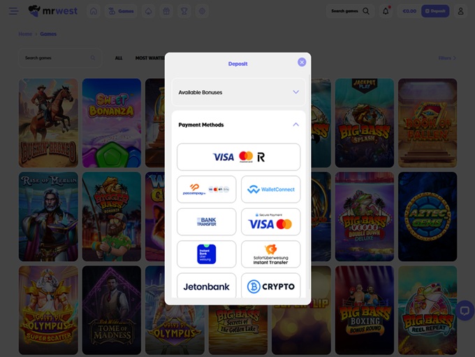 MrWest leans into modern payment methods by supporting leading cryptocurrencies for deposits. Whether you’re using Bitcoin, Ethereum, Litecoin, or another major token, the process is quick and direct.