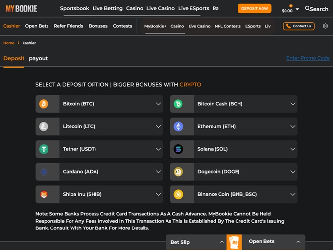 MyBookie also supports ten different cryptocurrencies, including Bitcoin, Litecoin, Ethereum, Tether, and Binance. These cryptocurrencies have a $20 minimum deposit with no maximum limit.