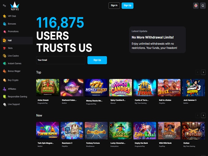 Niyvi Casino shows great potential, offering a vast selection of slots, table games, and live dealer experiences. Its crypto-focused payment system ensures fast transactions and added privacy, making it a solid choice for players who prefer digital currencies.