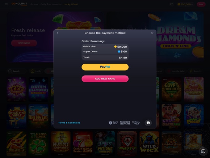 NoLimitCoins Casino, while primarily a social casino with no purchase obligation, offers the option to buy Gold Coin bundles that come with bonus Super Coins. This feature gives players more flexibility to enhance their gaming experience. Purchases can be made using various payment methods, including credit/debit cards (Visa, Mastercard, Discover), Apple Pay, PayPal, and Trustly Online Banking. Most Gold Coin bundles include complimentary Super Coins, adding extra value to your purchase!