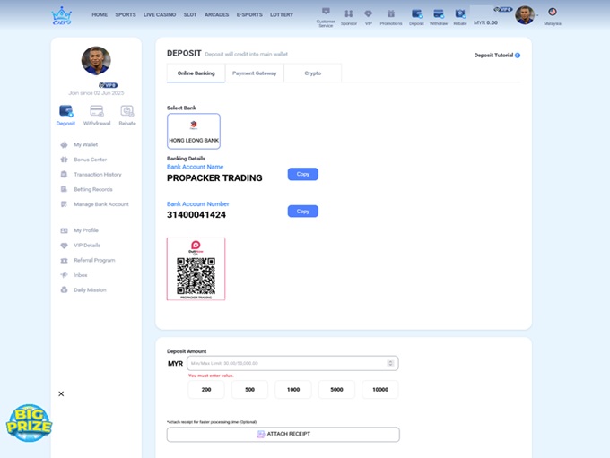 The platform offers a small number of payment options. However, the positive aspect is that the platform offers some crypto methods like Bitcoin, Ethereum, and Tether as well as some locally used ones like Maybank, Hong Leong Bank, EeziePay, TruePay QR, and TruePay.