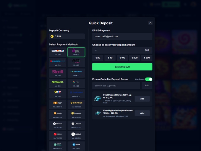 The platform offers a wide range of payment options like Ripple, Bitcoin, Ethereum, Jeton, Litecoin, MiFinity, Neteller, Skrill, Tether, Visa.