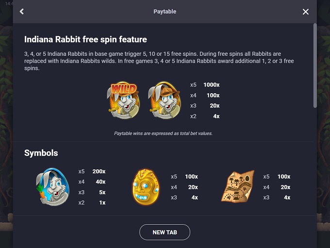 - Besides being the only special symbol in the game that can trigger the free rounds, Indiana Rabbit is also the highest paying icon. It pays for two and more identical icons anywhere on the screen - 4x, 20x, 100x, and 1000x.