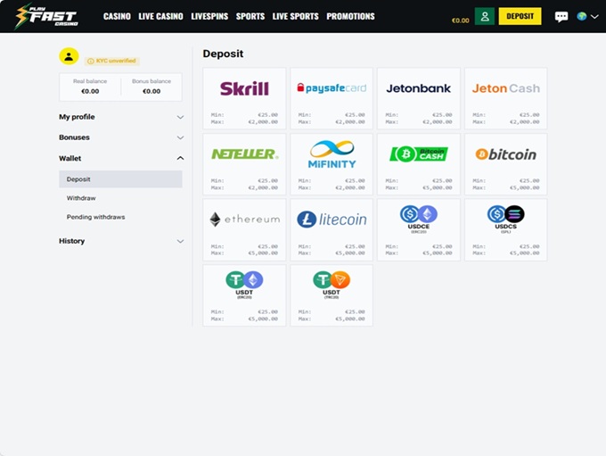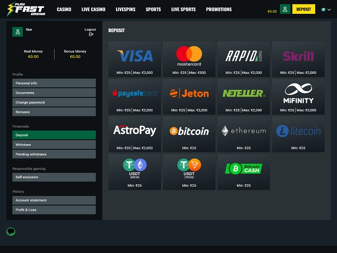 Play Fast Casino accepts deposits in Euros, Russian roubles, Japanese yen, Brazilian reals and British pounds alongside American, Australian, Canadian and New Zealand dollars via a wide range of payment methods. However, it should be noted that such transactions come with a €20 ($21) minimum and have their availability tied to the punter’s actual physical location.