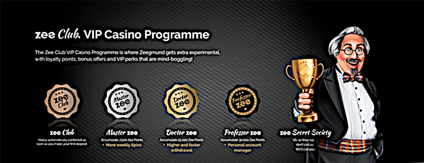 You'll run across him and his philosophy almost everywhere you go on the site - from the lobby to the game selector, and from the promo pages to the Zee Club VIP Programme, where he stretches his imagination to boggle your mind with way-out combinations of perks, loyalty points, and bonus offers until you reach the Secret Society level (by invitation only).