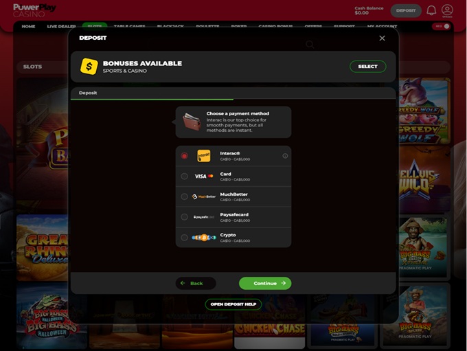 After you complete registration, it’s time to deal with banking - if you want real-money gambling, you need to top up your account. So, what are your options? PowerPlay has a wide range of banking options that facilitate the sometimes tedious process of depositing and withdrawing money. The options are very flexible and, for starters, include classic methods like Visa and MasterCard, which are fast and reliable for most players in Canada. Interac is also available - an almost indispensable method for Canadians as it allows instant transfers directly from your account.