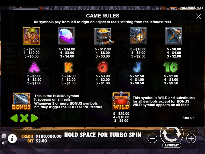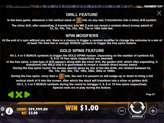 Free Spins - When three or more silver Drills as Bonus symbols appear anywhere on the reels, the Gold Spins feature is triggered with 6, 8, or 10 Free Spins. During free rounds, a new type of Drill will appear along with the silver one. After expanding, golden Drills transform into Wild and reveal guaranteed random cash rewards. Money awards given by any of two Drills during free rounds are random between 5x, 10x, 15x, 25x, 50x, 75x, 100x, 200x, 500x, and 1000x.