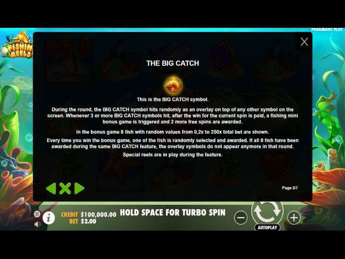 - The Big Catch – comes with a Big Catch symbol which will appear randomly on top of any other icon. Catching 3 of these icons, a mini – game gets triggered after current wins are paid, providing 2 spins free of charge.