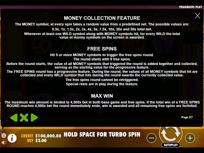 Money Collection Feature - Beer mug as a Money symbol appears with a random value from a predefined set: 0.5x, 1x, 1.5x, 2x, 3x, 4x, 5x, 7.5x, 10x, 20x, and 50x the total bet. Whenever at least one Wild icon lands with Money symbols, the total value of Money icons on the screen is awarded for every Wild. Those instant cash prizes can significantly boost players’ balance.