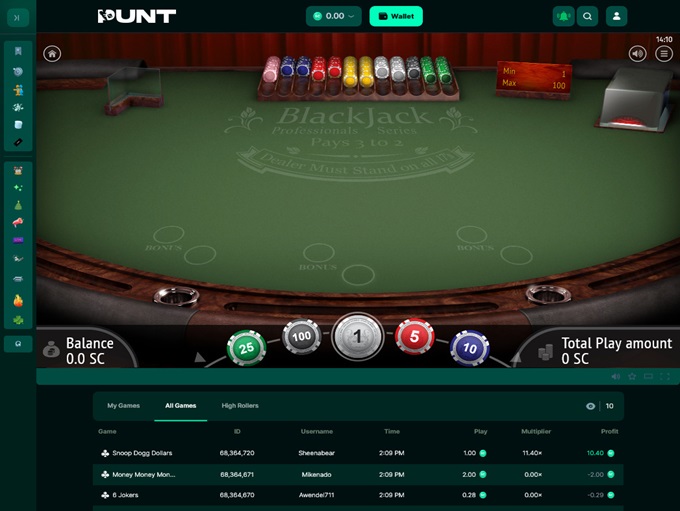 Punt Casino offers an extensive collection of games, closely mirroring its sister site, Chanced Casino. With over 950 titles available, the selection is predominantly slots, making up more than 95% of the library. The remaining options include a handful of table games such as blackjack, roulette, and baccarat, as well as live dealer variants – a pleasant surprise, considering live dealer games are a rarity in social casinos.