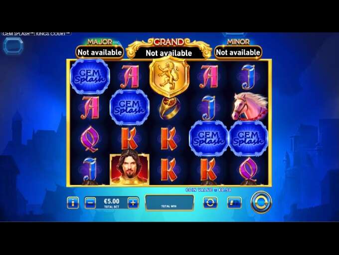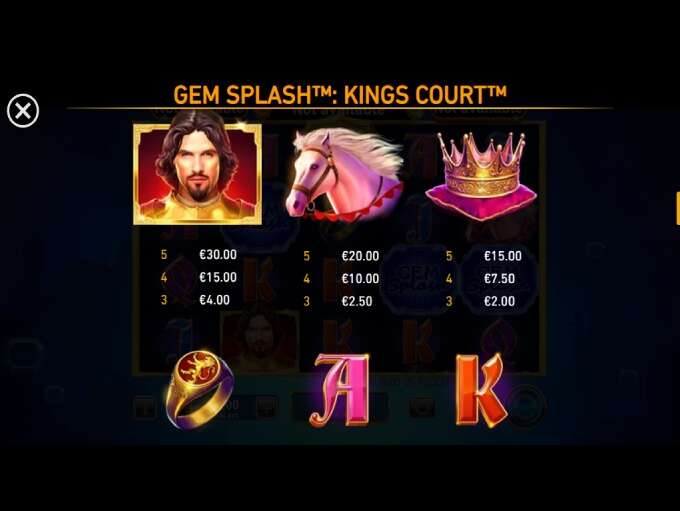 Gem Splash Kings Court is 5 rows 4 reels online slot offering 30 ways of winning. The minimum bet starts at 0,1 and goes all the way up to 500 coins per spin.