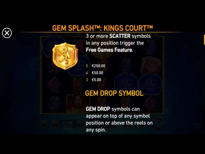 - Scatter is depicted as a golden lion sigil, Gem drop symbol is shown as a blue gem while the Gem Splash icon is pictured on a blue backdrop.
