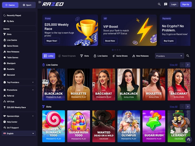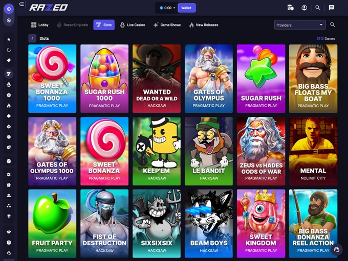 Razed offers many gaming options, ensuring something for every player’s taste. The casino section boasts over 4,000 games, including exciting classic and new slots like: