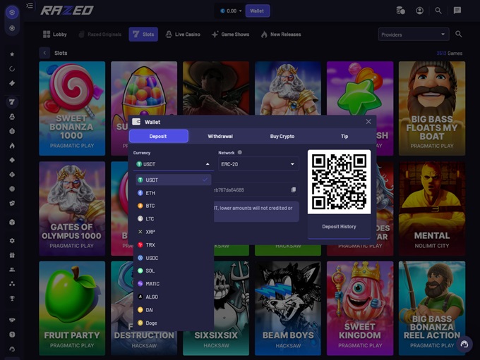 One standout feature is the exclusive Razed Originals collection, which includes unique in-house games like Dice, Keno, Mines, Coin Flip, and others. These games are designed with provably fair technology, ensuring transparent and trustworthy play.