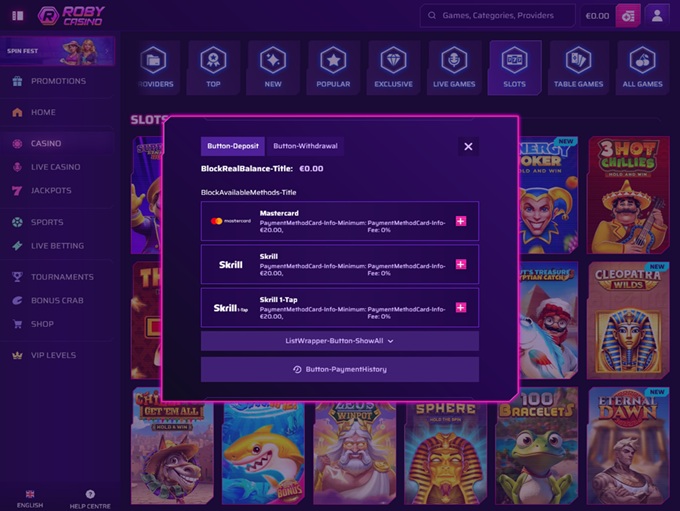 Roby gives you plenty of choice when it comes to payments. Fiat methods are covered through the usual routes like bank transfers, cards, and e-wallets. Crypto is on the table too, with familiar names like Tether, Ripple, and Dogecoin.