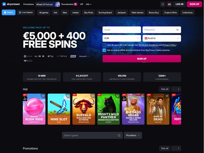 SkyCrown Casino is an online supersite with thousands of games in every niche and genre. The site is organized by game types and the series of collections make it fun and easy to “go with a theme” or play a favorite type of game like one with cascading reels, sticky or stacked wilds, or games with a bonus buy feature.