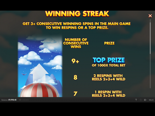Winning Streak – this feature is triggered after landing 3 consecutive spins, and you can progress along the meter as your balloon moves up. The meter itself consists of 7 levels with the top one providing you with an opportunity to win the 1000x jackpot.