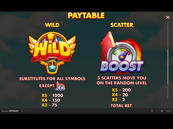 - Wild is depicted as a picture of a balloon with a Wild title while Scatter is represented as a speedometer