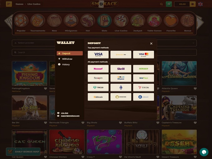 SmokAce is home to some of the industry's most popular software providers like Yggdrasil, BetGames.TV, Big Time Gaming, Pragmatic Play, Play’N Go, Evolution, Quickspin, Fugaso, Netent, iSoftBet, Thunderkick, Red Tiger, Playtech, Iron Dog Studio, Blueprint, ELK Studios, Betsoft, Microgaming, and others.