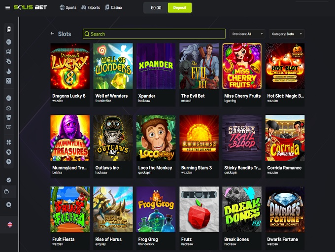 Solis Bet Casino has teamed up with a concise group of game providers—exactly 10 in total! This selection might seem a bit limited and perhaps not fully comprehensive. Nevertheless, considering the casino’s youthful debut, it’s highly likely that the lineup of software developers will grow in the coming days. What’s worth noting is the presence of well-regarded and notable names like Pragmatic Play, BGaming, EvoPlay, BBGames, Gamzix, Quickspin, SmartSoft, and Wazdan, among others.