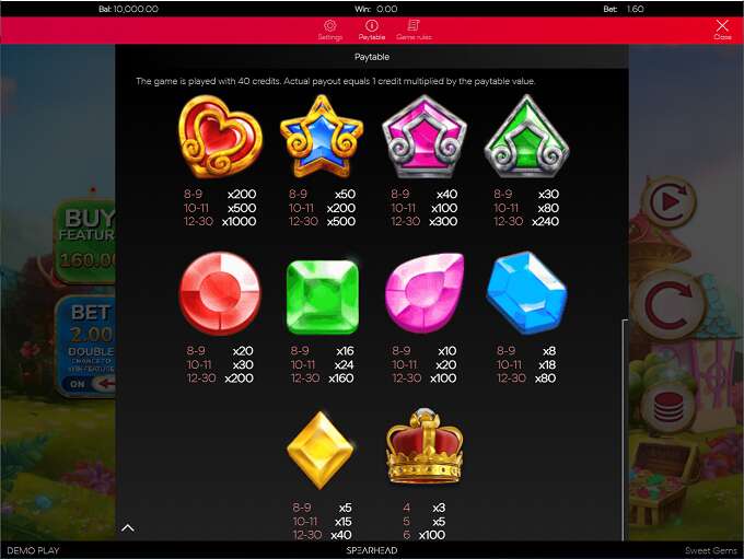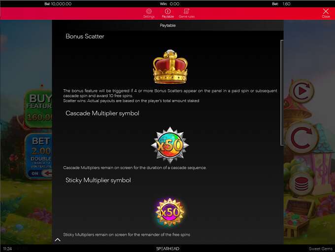 Sweet Gems is an online video game released in June 2021 by Spearhead Studios which comes on a 6x5 where 8 or more identical symbols awards a payout. Also it comes with popular features such as Free spins, Cascades, Multiplier and more!