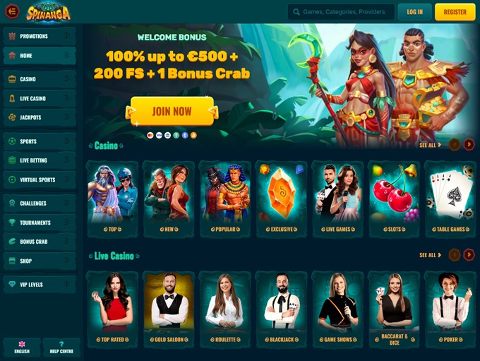 Spinanga is positioned as a contemporary online gambling platform, distinguished by its engaging design and user-friendly interface. The appealing graphics incorporate an Aztec-inspired jungle theme, creating a welcoming ambiance. The left-side menu ensures straightforward navigation, granting clear access to all page sections. Moreover, the additional features, such as a secondary menu at the bottom, extra links, and a sitemap, enhance overall navigation, contributing to a user-friendly experience.