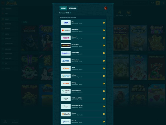 Spinanga offers a wide range of payment options and some of the available methods come from the world of cryptocurrency. Anyhow, there is a good mix of payments, like Mastercard, Skrill, Neteller, MiFinity, Jeton, Visa, CashToCode, Tether, Bitcoin, Litecoin, Ethereum, USD Coin, Binance, Dogecoin, Solana, Shiba Inu, or Tron