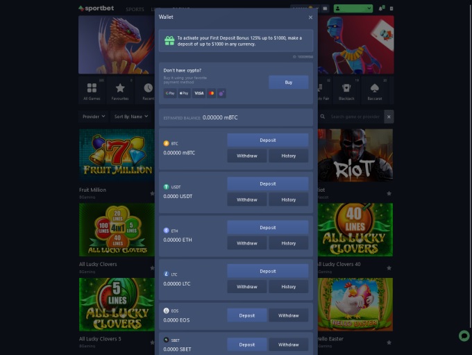 When it comes to crypto deposits, Sportbet.one showcases an array of options, demonstrating its commitment to a diverse clientele. They readily accommodate Bitcoin (BTC), Tether (USDT), Ethereum (ETH), Litecoin (LTC), EOS, and their in-house token, SBET.