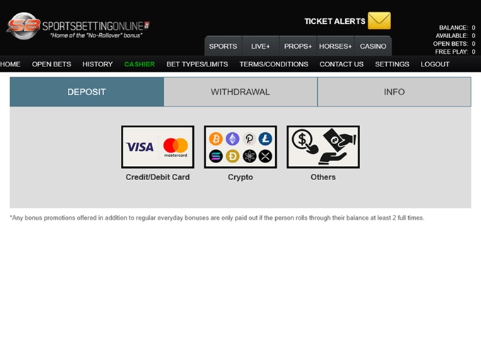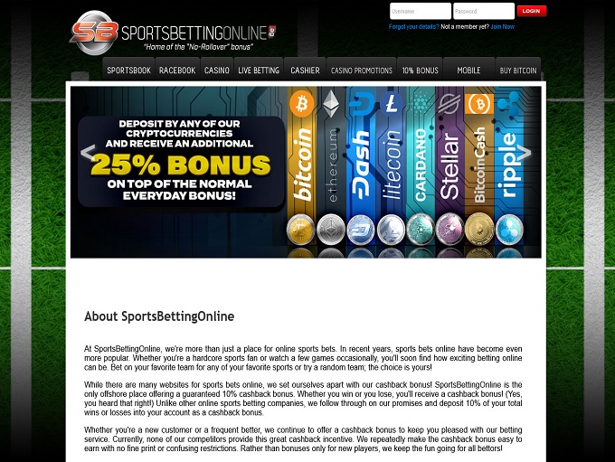 At the top of the homepage, you can find several tabs, including Sportsbook, Racebook, Casino, Live Betting, Cashier, Casino Promotions, 10% Bonus, Mobile, and Buy Bitcoin, so you can easily find your favorite section.