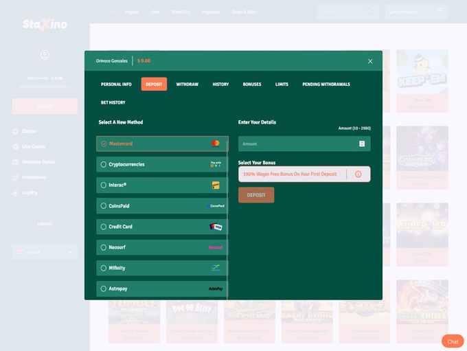 As a standout choice in the global online gambling market, StaXino Casino supports deposits and withdrawals through several methods, including Visa, Mastercard, Interac, Skrill, Neteller, MiFinity, Paysafecard, Cashlib, CashToCode, Contiant, CoinsPaid, Binance Pay, Bitcoin, Litecoin, Ethereum, and Tether.