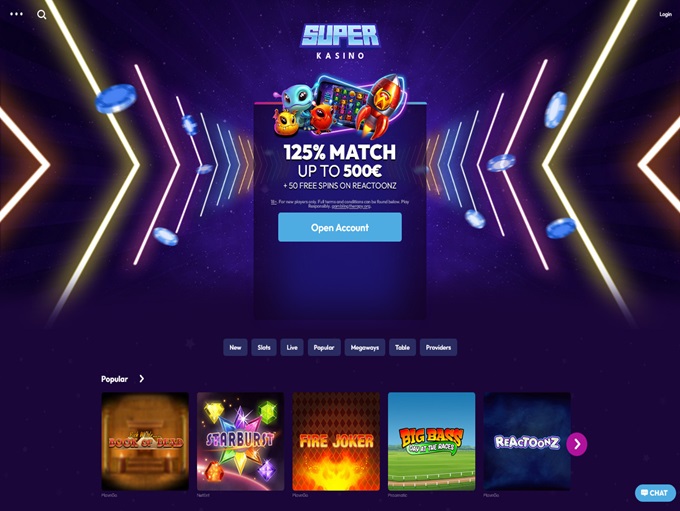 Boost your gaming experience with instant login and superfast payments at SuperKasino. Leveraging split-second banking through Brite, this online gambling house offers a diverse array of slots, table games, live casino streams, and life-changing jackpot titles from numerous leading providers.