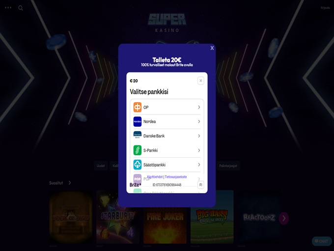 As we mentioned in the introductory part, this casino operates as a Pay n Play casino, meaning it supports a single payment method. While most no-account casinos use Trustly, Super Kasino has opted for Brite as its primary payment solution.